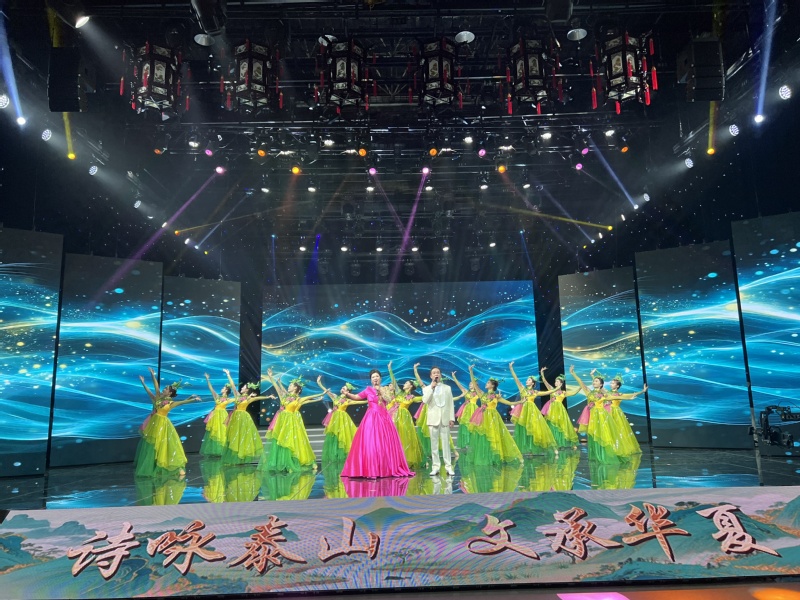 当旋律响彻舞台时,刘炳强教授与高霞老师联袂献唱,歌声激越、气宇轩昂。张冉老师指导的16名艺术学院舞蹈团学生,以融入泰山文化深厚底蕴的灵动舞姿翩跹起舞,为这场精彩纷呈的文化盛会注入了昂扬蓬勃的青春朝气。