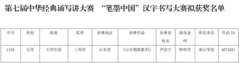 近日,第七届中华经典诵写讲大赛“笔墨中国”汉字书写大赛圆满完成全部赛程,赛事结果正式揭晓。艺术学院2024级书法专业1班学生尹驭宁凭借出色表现,在师范院校学生组中斩获三等奖,为学院和学校增添了荣誉。