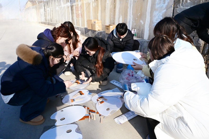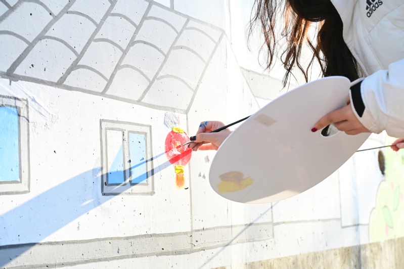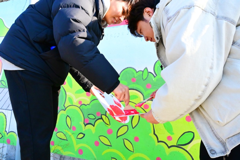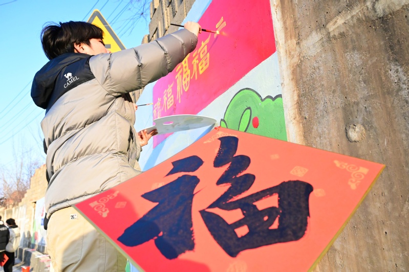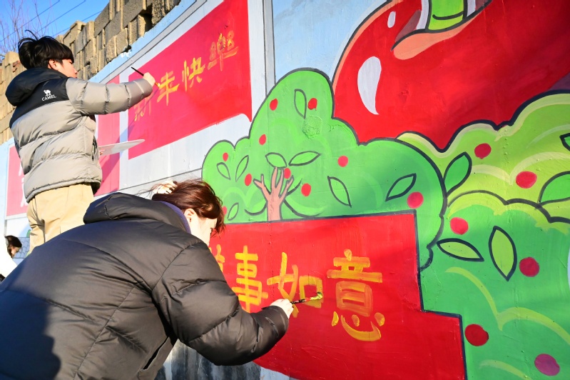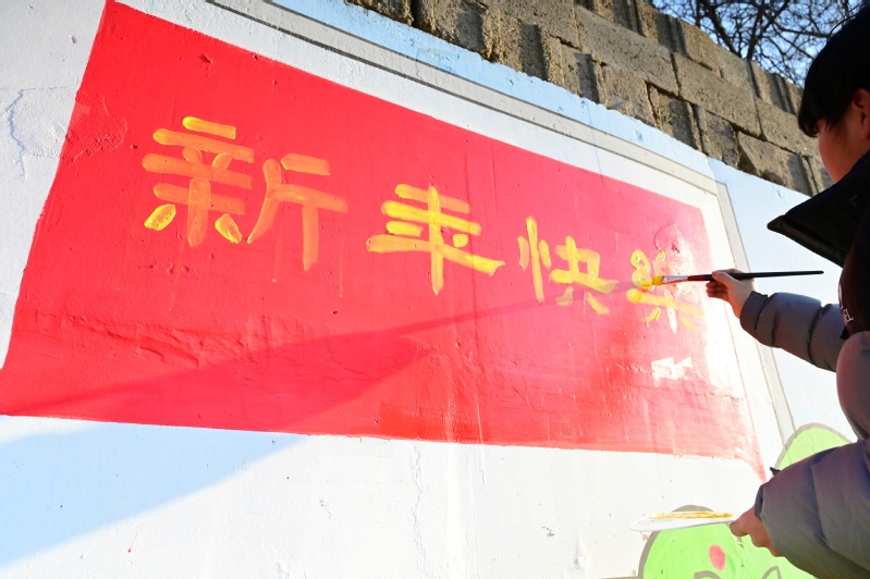 画到兴浓时,师生们即兴发挥,创作了一系列大红灯笼、中国结、形态各异的“福”字等年味浓郁的精美图案,墙上的“福马迎春”“新年快乐”“万事如意”等祝福语更是仿佛带着温度,向过往村民传递着新年问候。