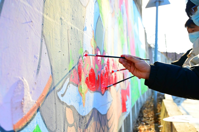 创作现场,师生们手持画笔与调色盘,专注地在墙面上勾勒、涂抹。大家时而凝神细描,时而退后几步端详效果。围绕“迎新春 美乡村”的主题,一幅幅充满生机与年味的画面逐渐在墙上“生长”出来。