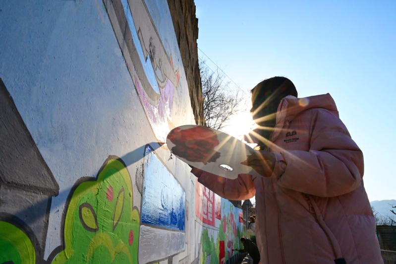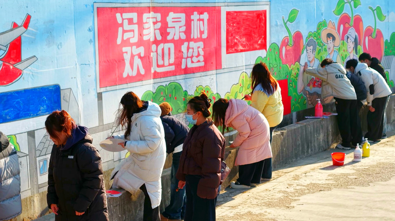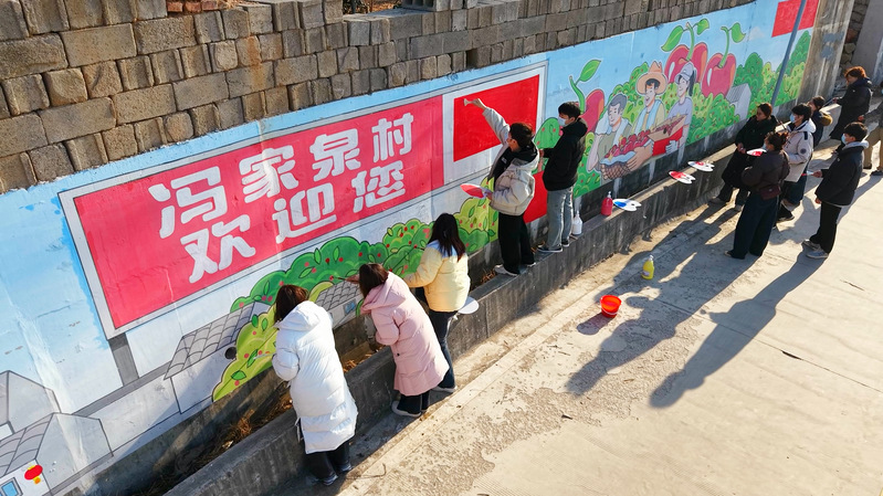 冬日暖阳下,位于泰山区徂徕镇的冯家泉村,一面面用石头垒成、略显破败的墙体悄然换上“新装”。樱桃红、麦浪金、福字红……斑斓的色彩在阳光下跳跃,仿佛为村庄披上了节日的盛装。